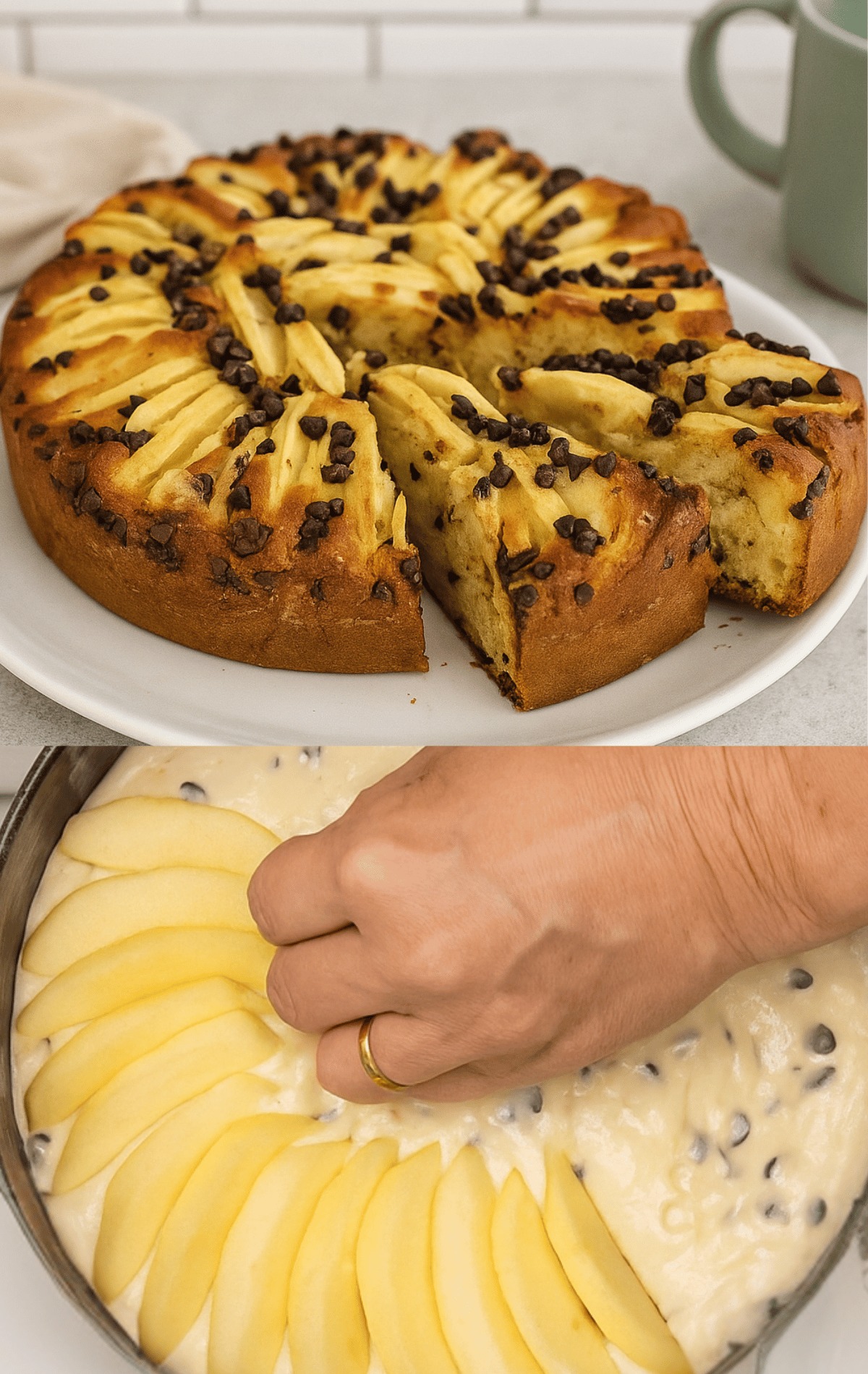 Objavte jednoduchý a neodolateľný taliansky recept: mäkký, šťavnatý a mierne šťavnatý jablkovo-jogurtový koláč, ideálny na raňajky alebo desiatu. Čokoládové lupienky dodávajú ešte lahodnejší nádych 😋