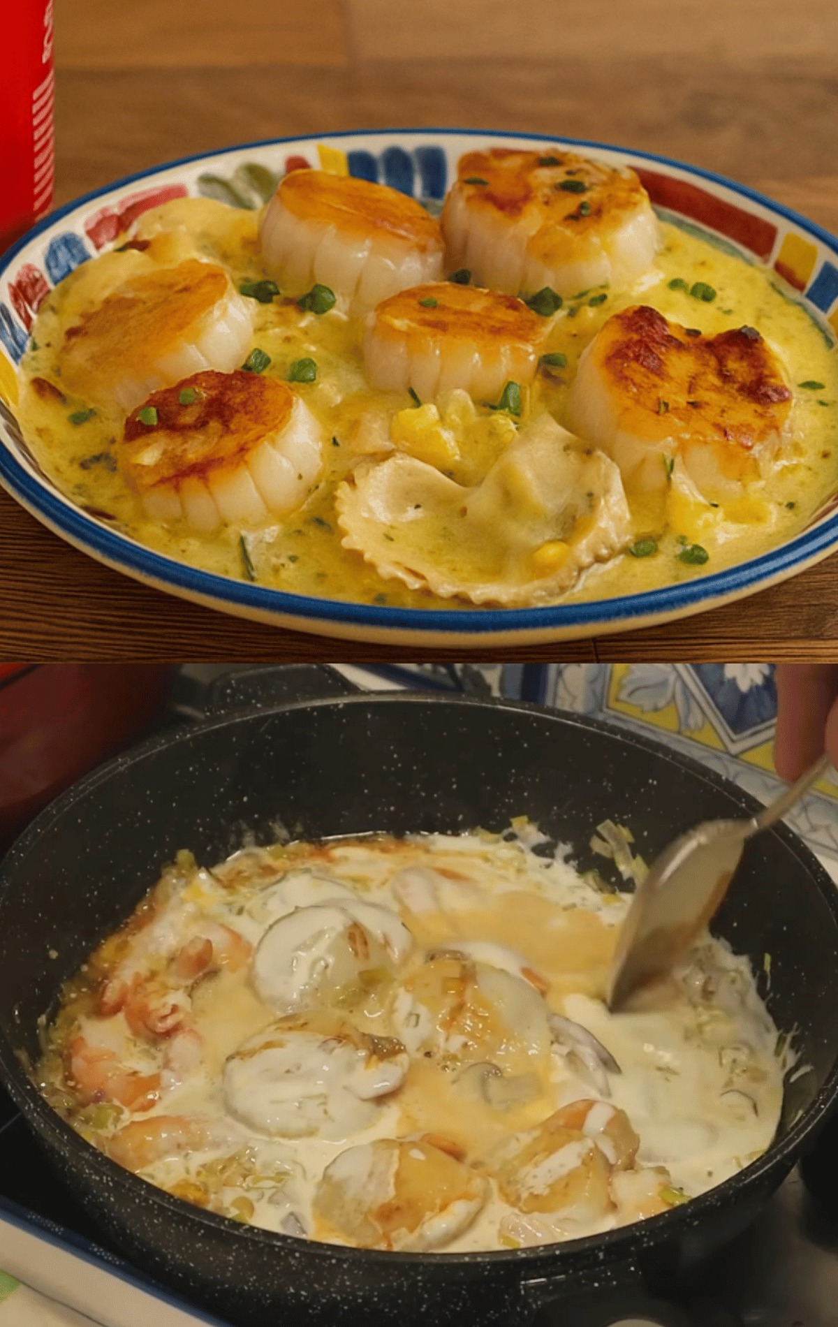 Na inej panvici rozohrejte trochu masla alebo oleja. Mušle opečte 1 až 2 minúty z každej strany, len aby zhnedli, ale nie prepečené.